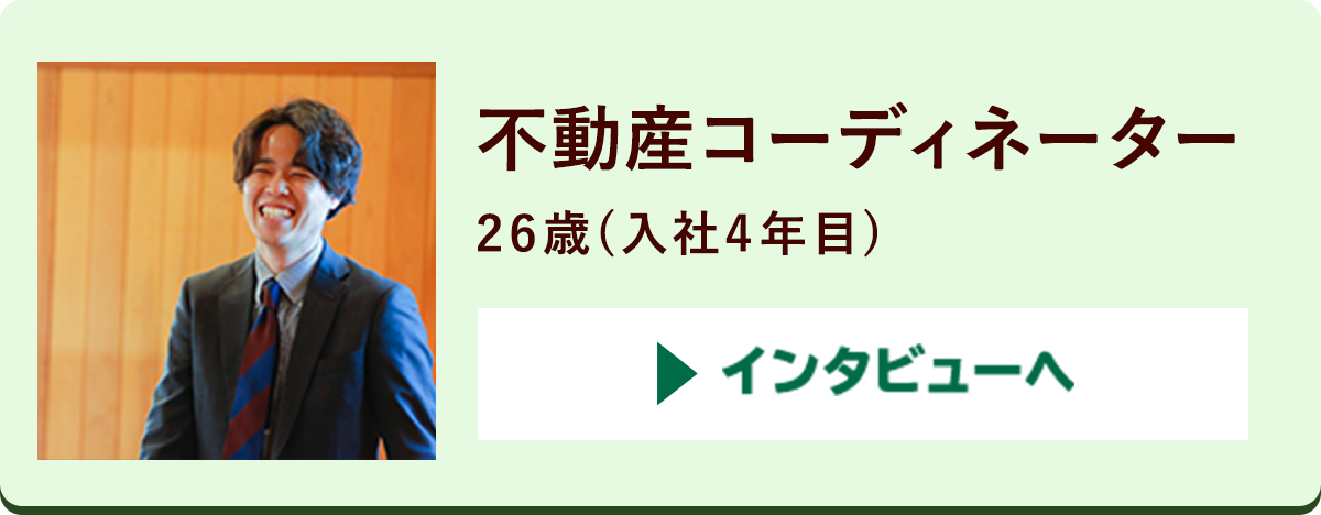 お客様にヒアリングをし価値観に合った暮らし方を不動産売買の仲介、賃貸仲介、リフォーム・リノベーションを通じてご提案をしています。 また地域の方に喜んでいただくためのイベントの企画提案、火災保険の提案、新サービスの企画など様々な業務を通じてあなたの強みを生かせるところで活躍できます。 |